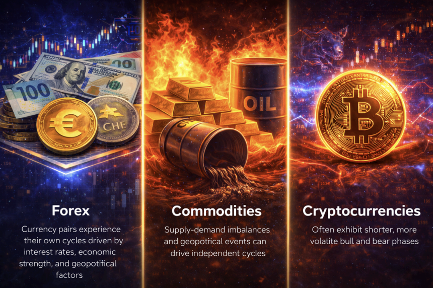 - Forex: Currency pairs experience their own cycles driven by interest rates, economic strength, and geopolitical factors.